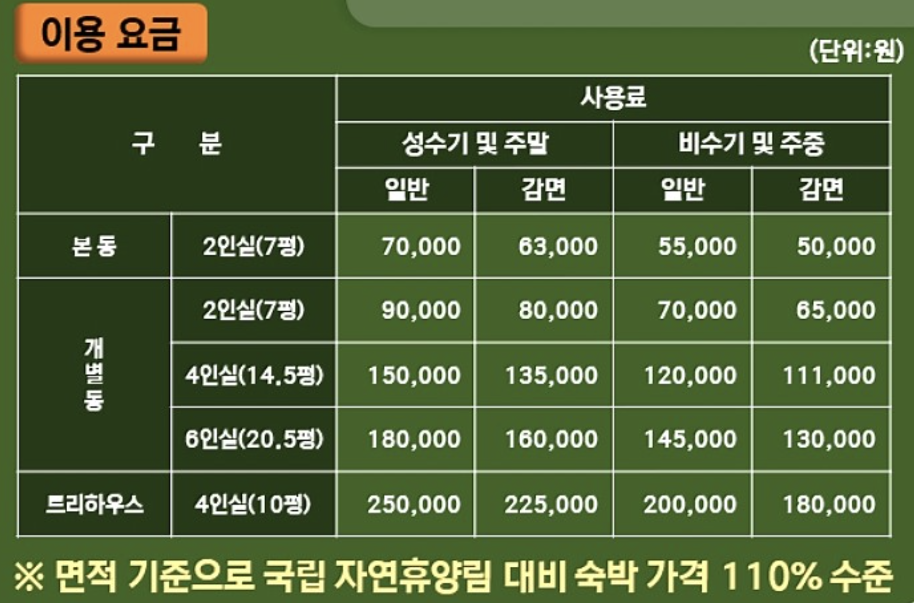 - 비수기의 경우 -> 주중 12만원, 성수기 및 주말 15만원 / 트리하우스 비수기 및 주중 20만원, 성수기 및 주말 25만원